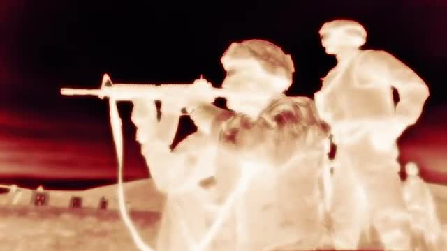 Negative shot of kneeling soldier shooting M4 rifle