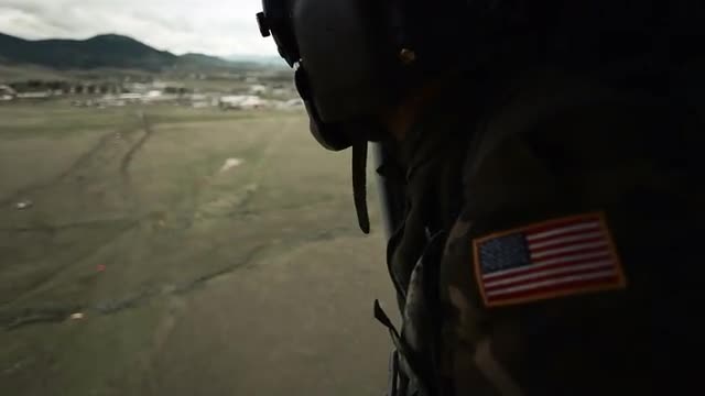 Shot from the inside of a Black Hawk helicopter while flying with a soldier looking out. Green Beret United States Army Special Forces.