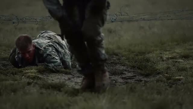 Soldiers crawling under low barbed wire at an obstacle course at a training for Green Beret United States Army Special Forces. It is muddy.