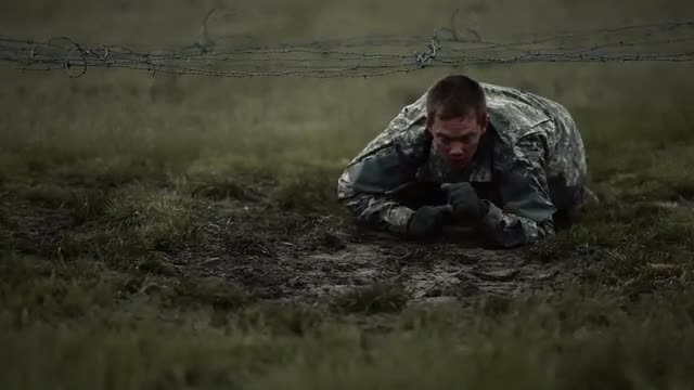 Soldiers crawling under low barbed wire at an obstacle course at a training for Green Beret United States Army Special Forces. It is muddy.