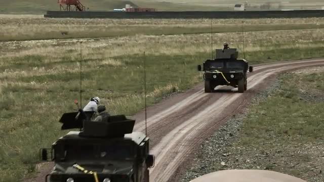 > Shot of two Humvees driving by instructor dressed as a middle easterner.