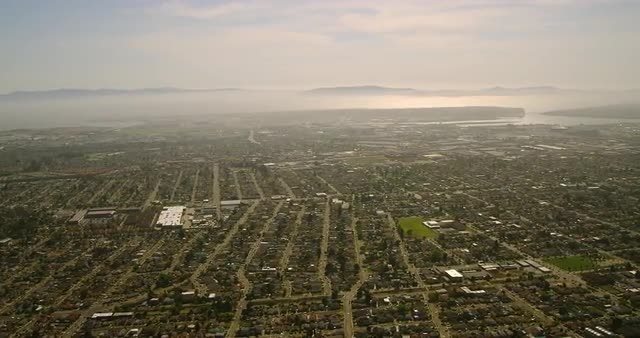 1002557 - Aerial coming over a hill revealing San Francisco and the Oakland Bridge