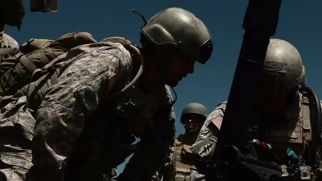 Close up shot of soldier aiming mortar launcher.