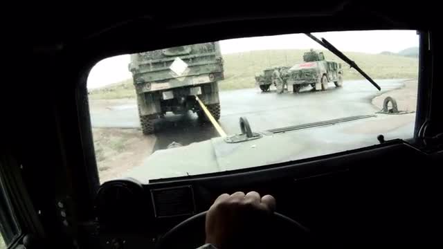 Humvee driving up road on hill in the distance. Green Beret United States Army Special Forces.