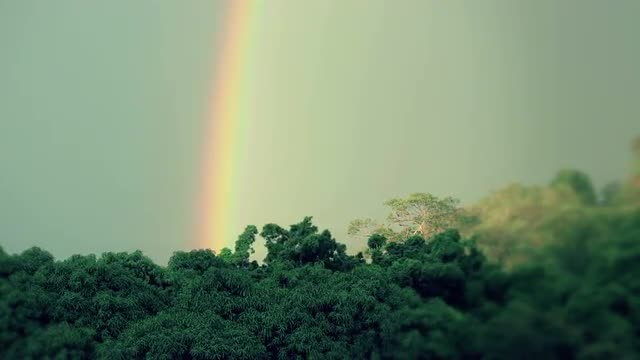 Timelapse of a rainbow forming over a tropical evergreen rainforest