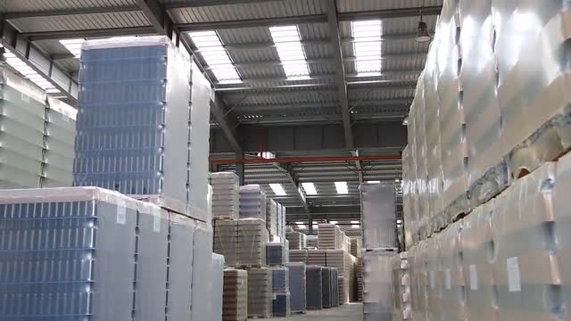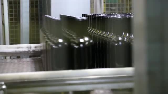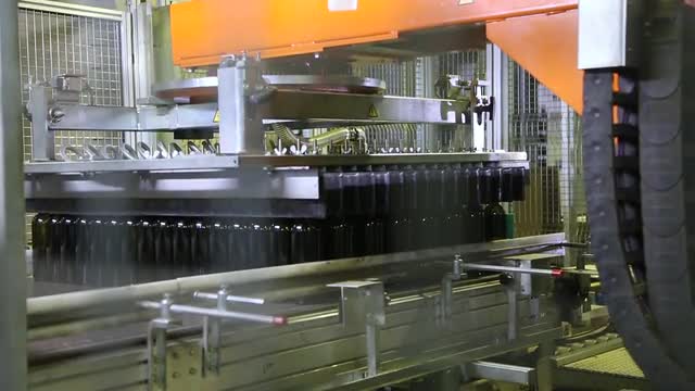 Modern warehouse with robotic machines. Logistics at the glass factory warehouse. Modern equipment. Packing of wine dark bottles in the workshop of the glass factory.
