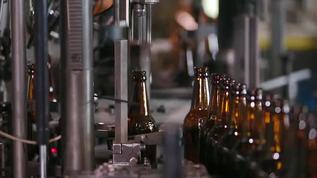 Beer bottle factory. Bottle production line. Beer brown bottles move along conveyor belt to the factory workshop. Technological line for bottling of beer in brewery. Rows of beer bottles in factory.