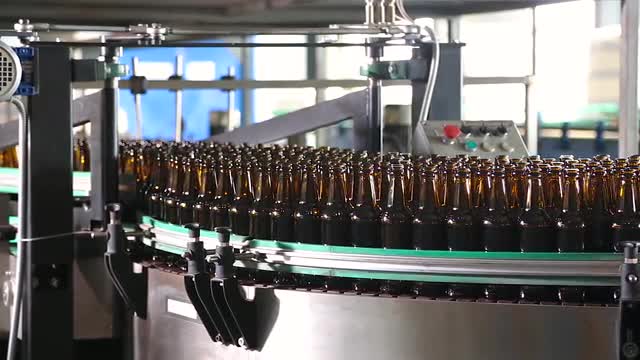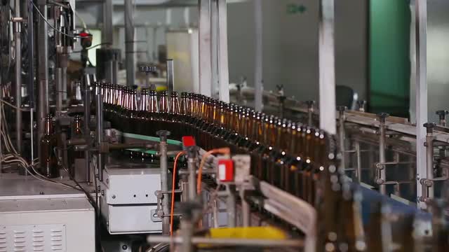 Wine bottles moving along a conveyor belt in a wine bottling factory. Bottle manufacturing technology in industrial factory. Glass recycling. Movement bottles. Production of glass bottles.