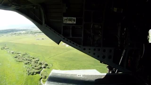 Sped-up footage from inside a CH-47 Chinook helicopter in flight. The ground below can be seen through the back hatch as the chopper flies over green fields and some homes. Part of a training for Green Beret United States Army Special Forces.