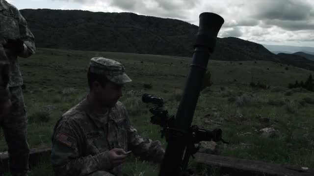 Slow motion shot of soldier adjusting mortar launcher. Green Beret United States Army Special Forces.