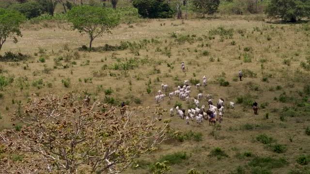 Cowboys herding cattle, tree in foregroudn, wide tele tracking rear view