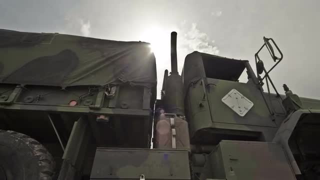 Dollying time-lapse alongside a covered military convoy truck filmed at a training with the Green Beret United States Army Special Forces. Clouds pass by overhead.