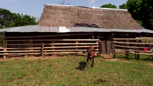 962856 - Cowboys bring down brown calf in corral, wide 60p