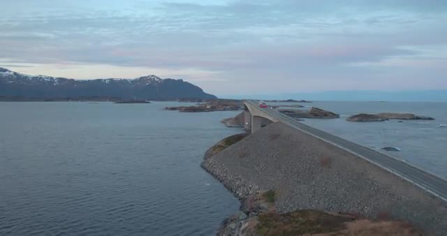 MORE / ROMSDAL, NORWAY – FEBRUARY,2017 : Aerial shot over amazing landscape at sunset with bridge and traffic in view