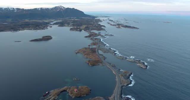 MORE / ROMSDAL, NORWAY – FEBRUARY,2017 : Aerial shot over amazing landscape at sunset with bridge and traffic in view