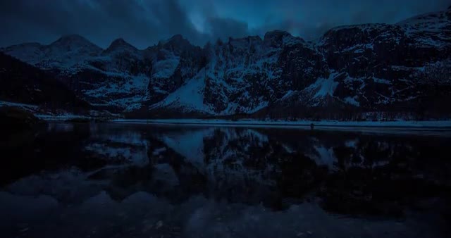 Amazing timelapse of snowy mountains at sunset with fjord and reflections