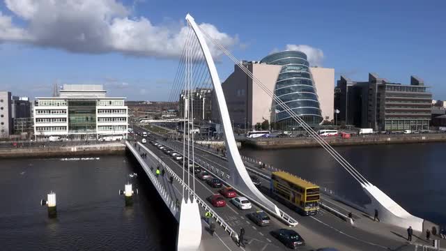 > Aerial view of Samuel Beckett Bridge and River Liffey in Dublin