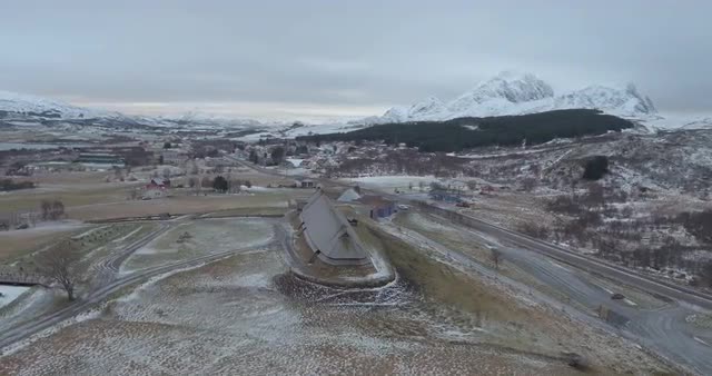 LOFOTEN, NORWAY – FEBRUARY,2017 : Aerial shot of Lofotr Viking Museum on a cloudy day with snowy mountains beautiful landscape in view