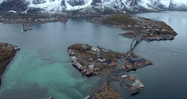 > Aerial shot over Lofoten islands at daytime with cityscape, snowy mountains