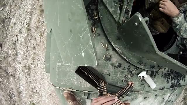 Moving shot of a soldier performing target practice with a machine gun on a humvee while it is diving. Green Beret United States Army Special Forces.