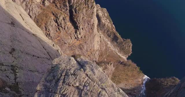 Video shot of Pulpit Rock at sunset looking down with fjord and cliff in view