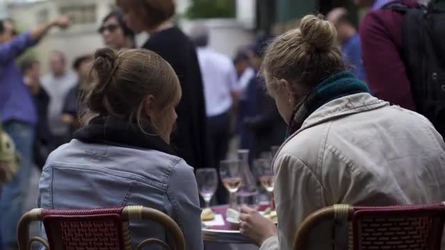 > Video shot of people enjoying restaurant on central Paris square