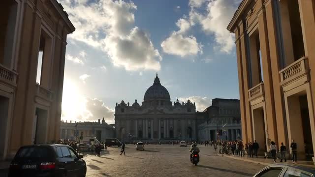 > Video shot of St Peter's Basilica on a beautiful day with traffic and Vatican