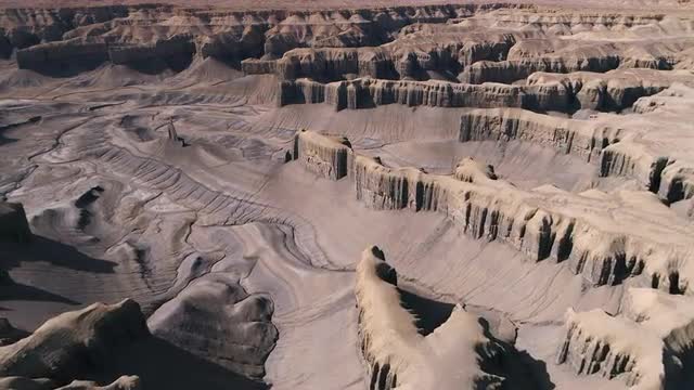 Aerial view flying over the Caineville Desert in Utah viewing maze of jagged cliffs across the landscape.