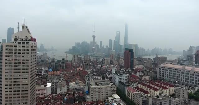 SHANGHAI, CHINA – JUNE 2016 : Aerial shot in Central Shanghai with cityscape and Huangpu River in view