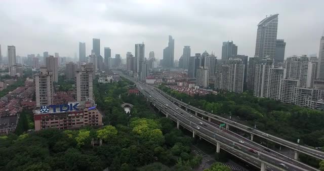 SHANGHAI, CHINA – JUNE 2016 : Aerial shot in Central Shanghai with cityscape, park and highway in view