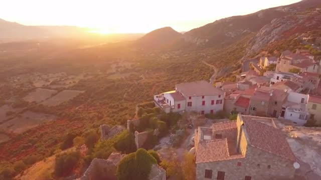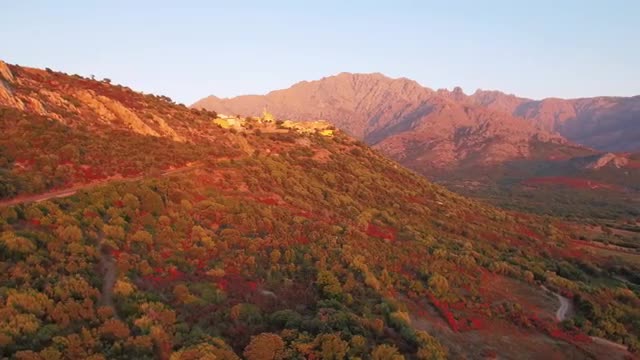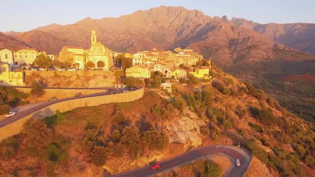 CORSICA, FRANCE – JULY 2016 : Aerial shot of the start of Corsica Mountain range with Monte Cinto and road in view