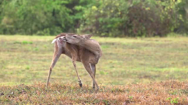 > White-tailed deer in field_licking itself.mov