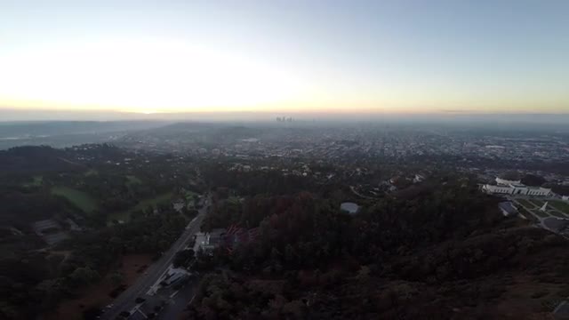 > Aerial shot over beautiful landscape at sunset with downtown LA in view