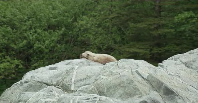 A large group of sea lions rest on a rock and interact with each other. Camera is shooting from a boat.