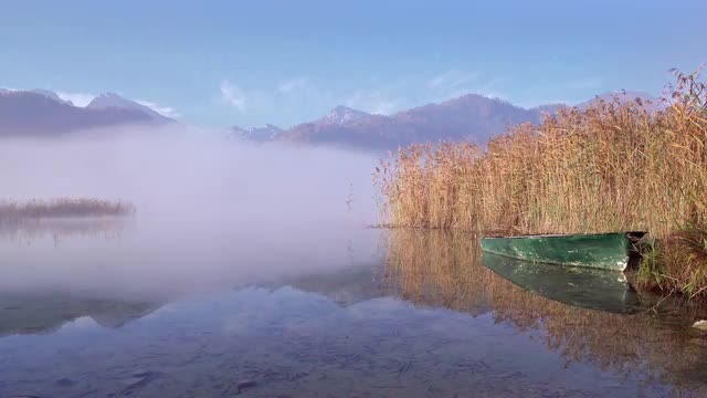 Epic golden lighting on forest river waves flowing under hazy lowland fog