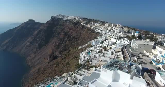 > Aerial shot over Santorini cityscape on a sunny day with beautiful landscape and cliff in view