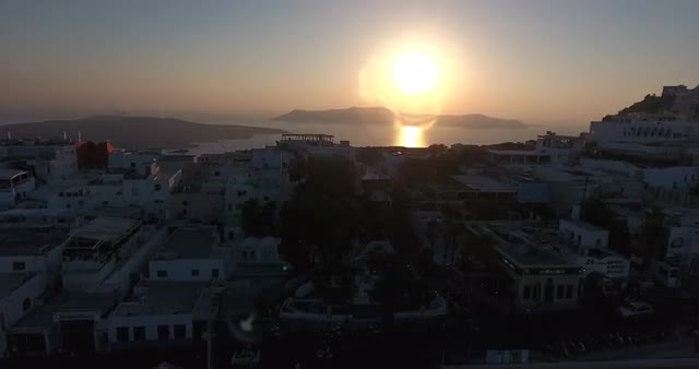 > Aerial shot over Santorini cityscape at sunset with beautiful landscape and cliff in view