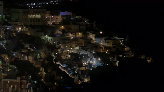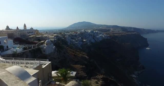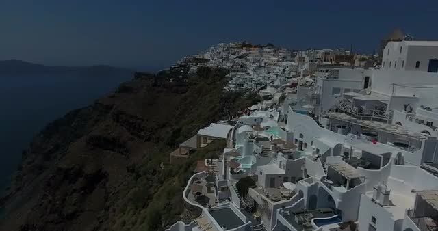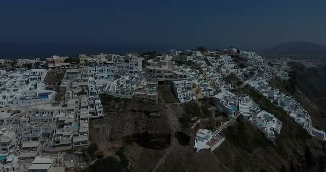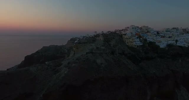 Aerial shot over Santorini cityscape at sunset with beautiful landscape and cliff in view
