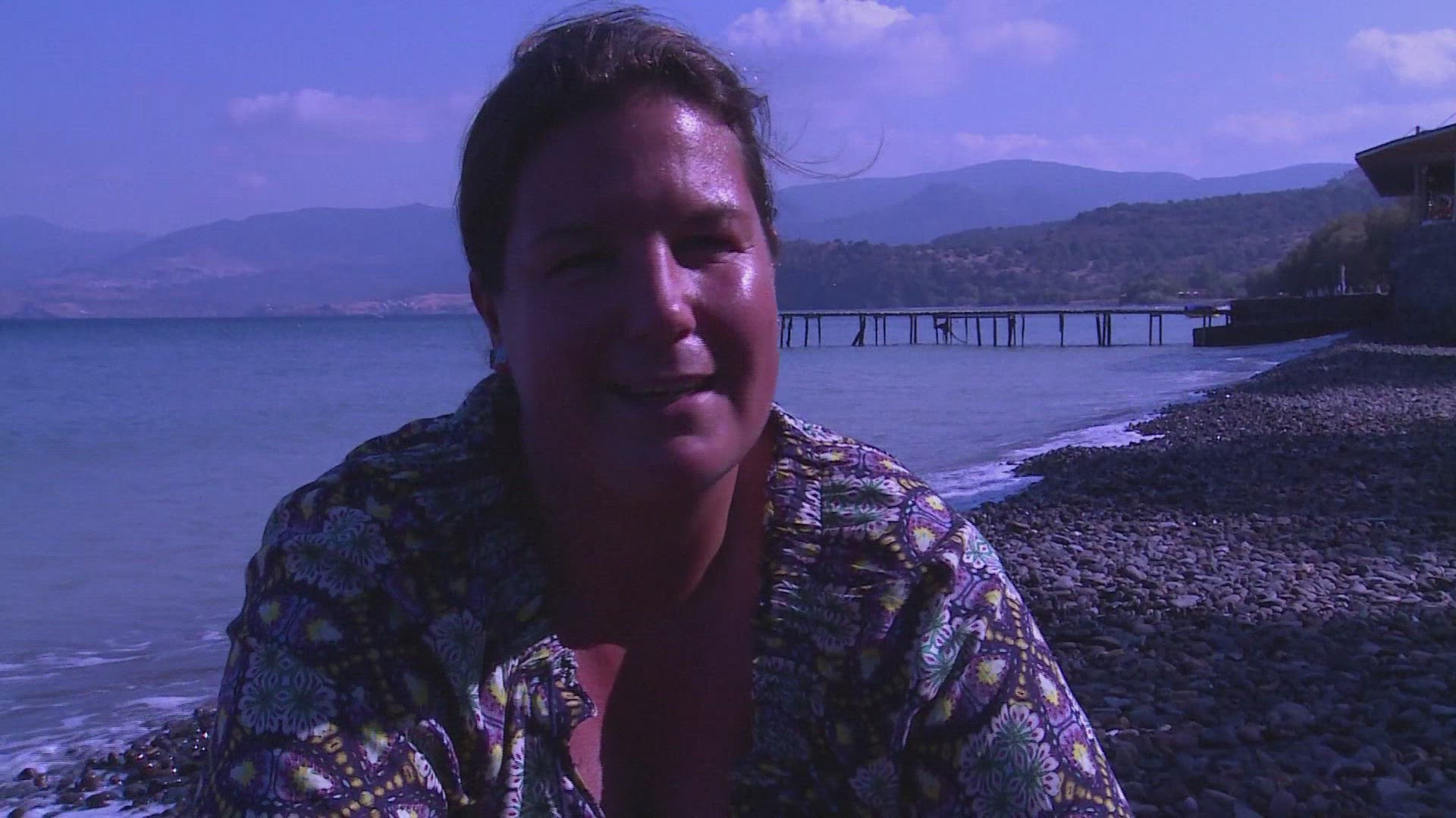 > Aerial shot of the Red Beach on a sunny day with beach, cliff and boats in view