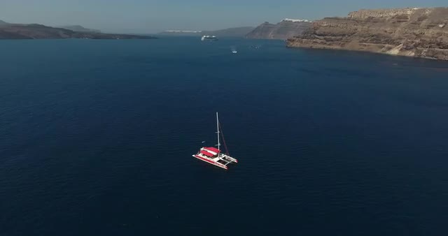 SANTORINI, GREECE – AUGUST 2016 : Aerial shot of sailboat on a sunny day with ferry and amazing landscape in view