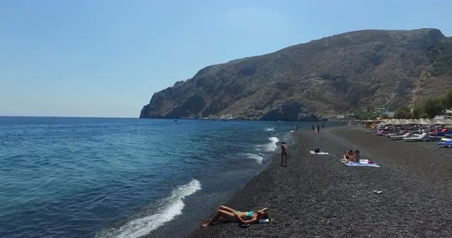 SANTORINI, GREECE – AUGUST 2016 : Video shot on beach on a sunny day with people, landscape and open sea in view