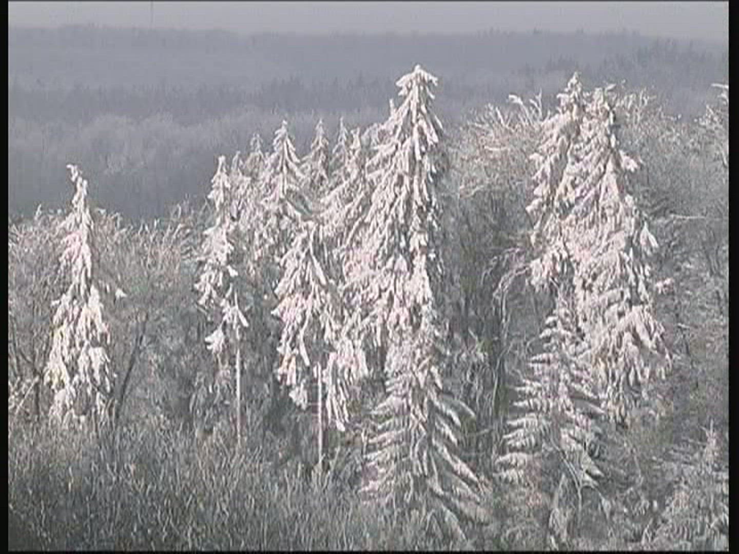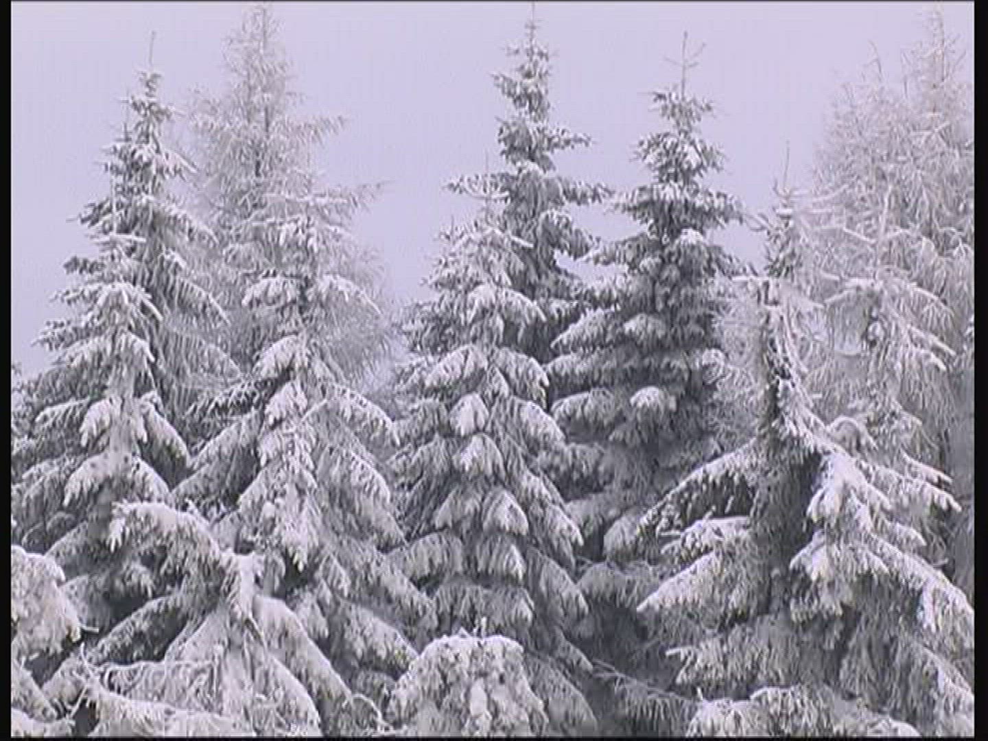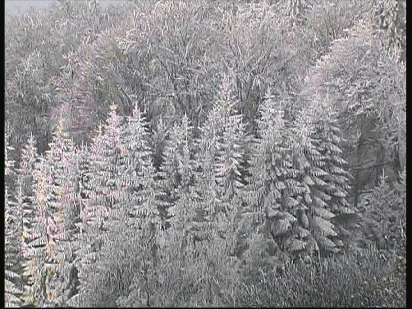 498377 - Wide shot of snow falling with dark forest in background