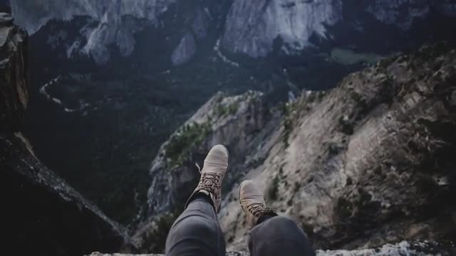 > Aerial Overhead Hiker Walking to Edge of Mountain Cliff Lookout