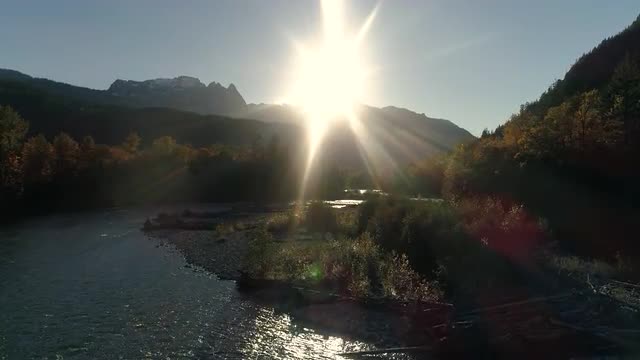 > Rising Aerial of Forest River in Fall Season with Sun Flare Above Mountain