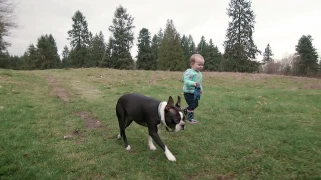 Baby Toddler Taking Family Pet Dog for Walk on Leash