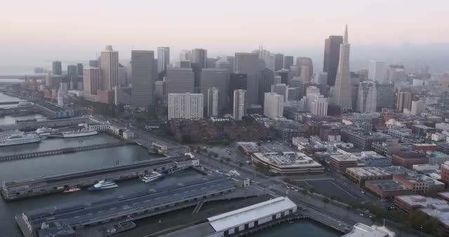 Low flying aerial shot of San Francisco city skyline and Embarcadero at sunrise .