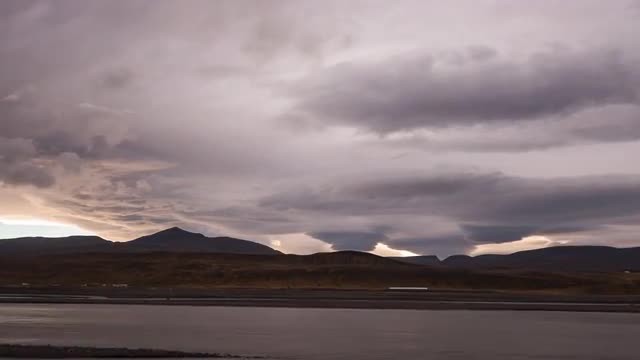ICELAND – 2016 : Timelapse of dramatic clouds moving at sunset with river and amazing landscape in view