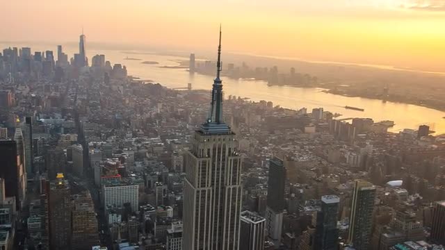 Aerial shot of Empire State Building from a helicopter at sunset