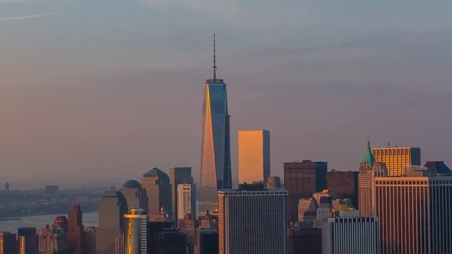 Aerial shot of Downtown Manhattan from helicopter at sunset with World Trade