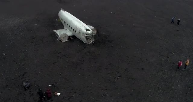 ICELAND – SEPTEMBER 2016 : Aerial shot over plane wreckage on black beach with people and black desert in view